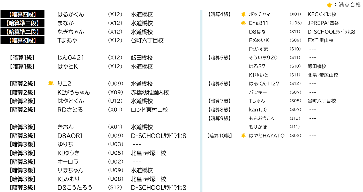 | 検定料 | 内部生(※1)[1-10級] 1,000円(税込)[段位] 1,500円(税込) 外部生(※2)[1-10級] 1,660円(税込)[段位] 2,160円(税込) ※1 通っている教室で受験する場合、内部生料金 ※2 通っている教室以外で受験する場合、及びネット生は外部生料金 |